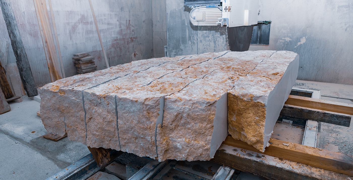 Un chantier qui débute par le sciage de blocs d’enrochement à l’aide du fil diamanté, puis un sciage à la débiteuse n°1 équipée d’un disque diamant de 1600 cm de diamètre pour créer les assises, ensuite un nouveau sciage, mais à la débiteuse n°2 et son disque de 900 cm de diamètre pour avoir obtenir la bonne longueur de moellons recherchée. Et enfin, dressage des arrêtes à la chasse pour obtenir une finition joints secs. Chantier bientôt terminé, il ne restera plus qu’à poser. Mais c’est une autre histoire… À suivre !